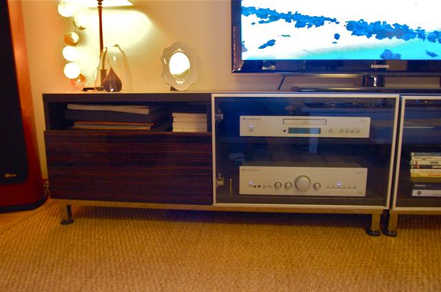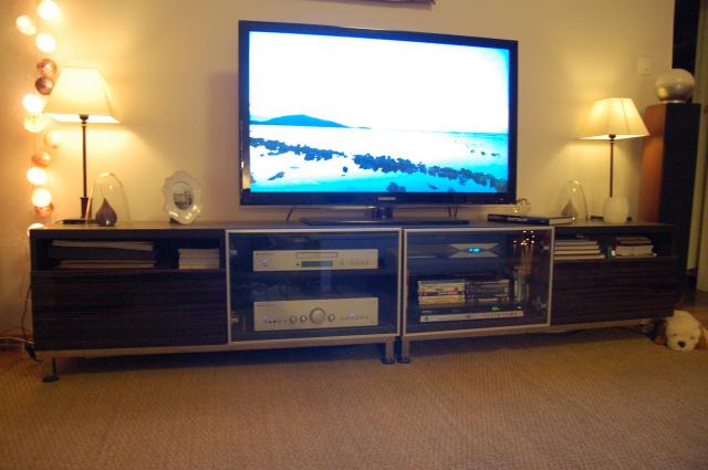 Ai trouvé un meuble chez IKEA , que j'ai acheté en double pour mettre tout le matériel hifi /video , avec TV 42" . J'ai pas de photos sous la main de suite mais il est très sympa . C'est un meuble bas , qui en doublé , donne 2 grands tiroirs de chaque côté en plaqué bois . Au milieu , 2 portes vitrées avecdes rangements à étagères amovibles pour installer amplis , lecteurs DVD ou autre ...